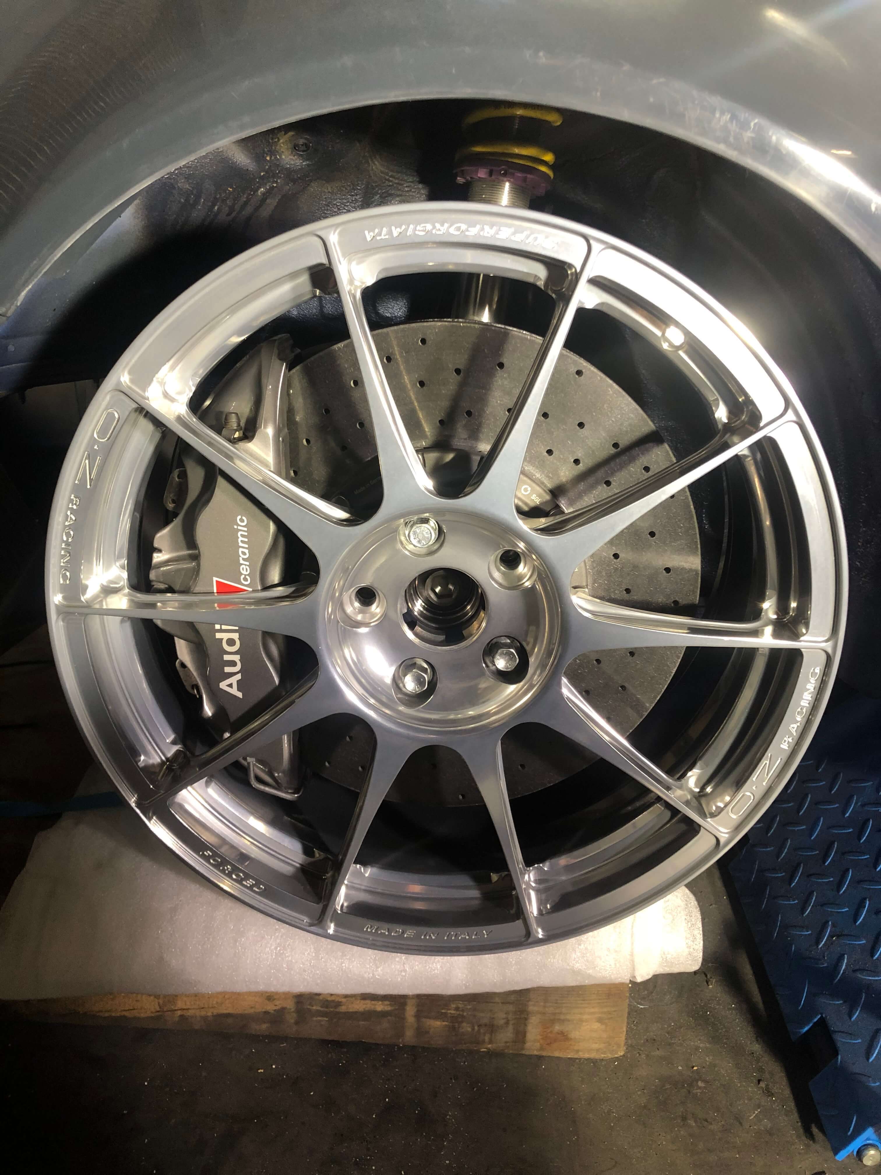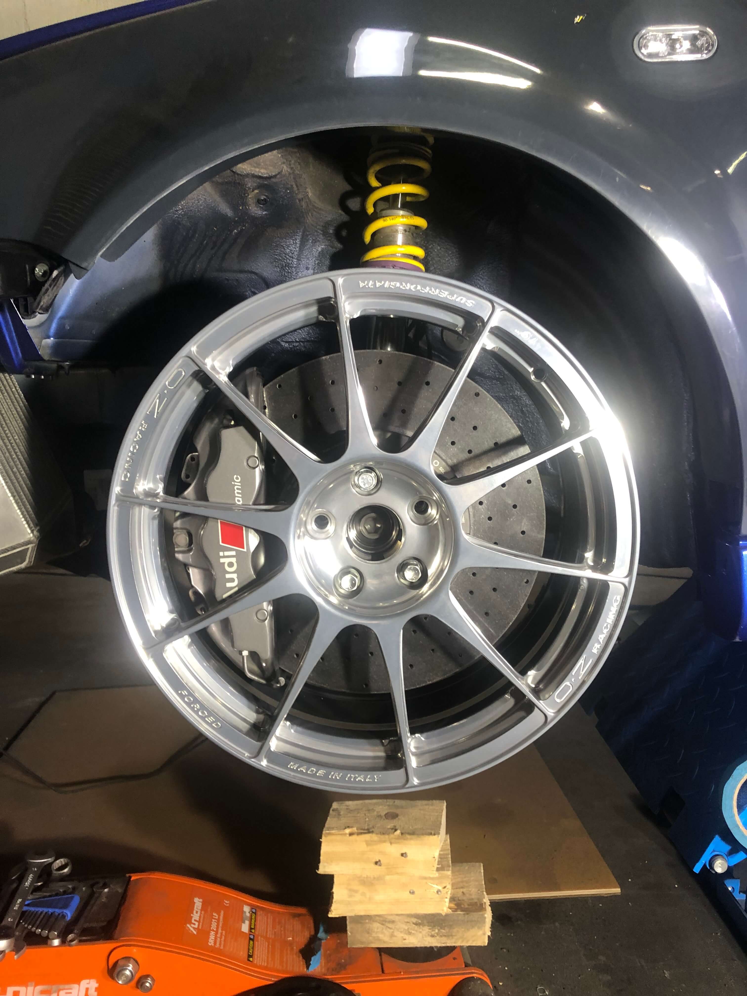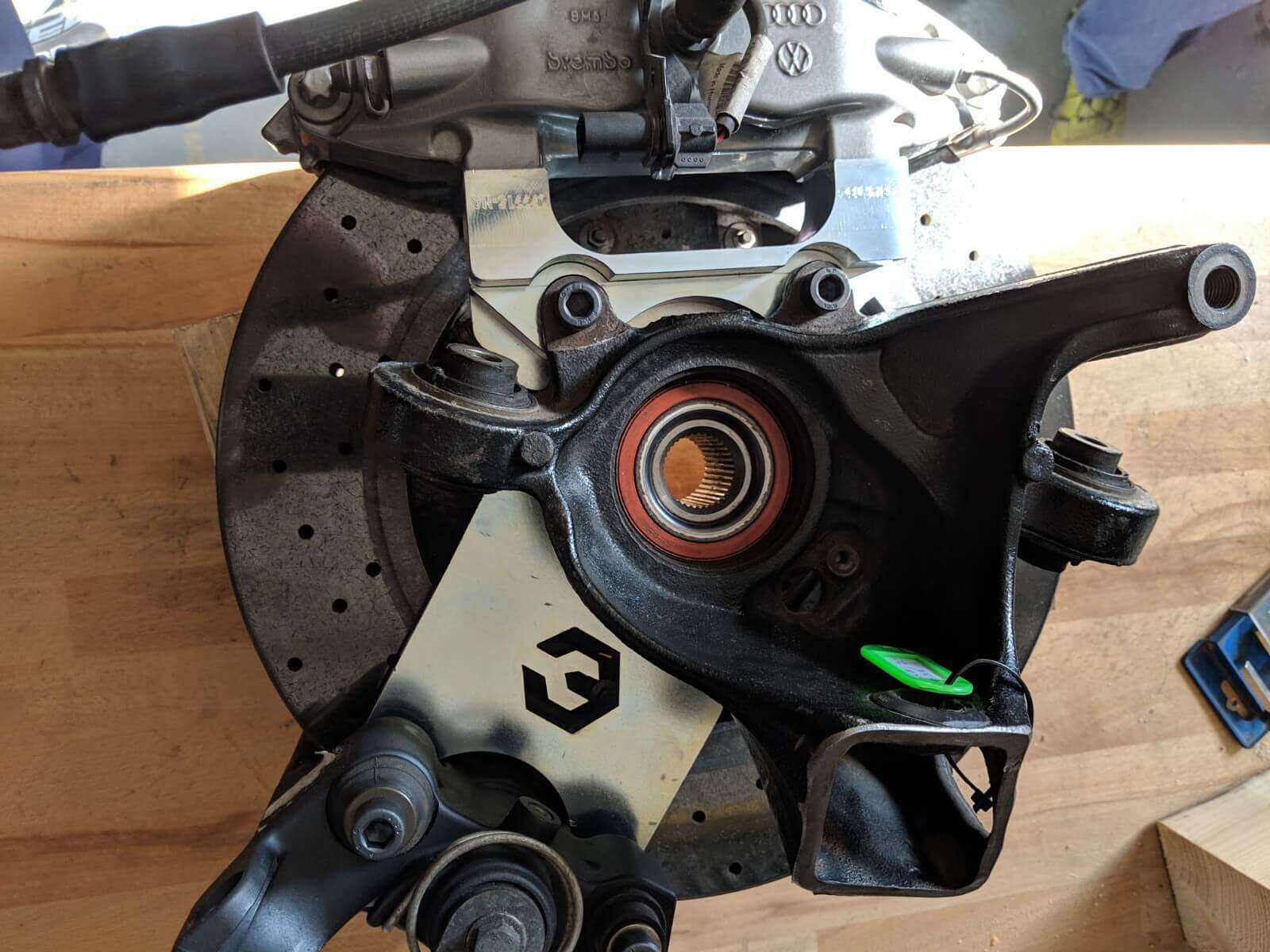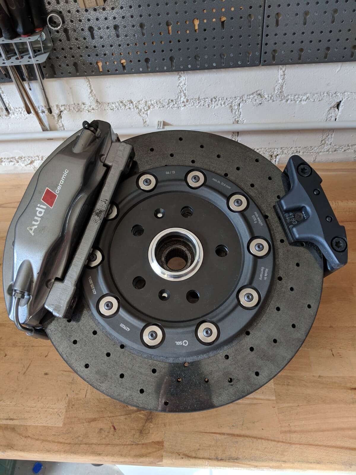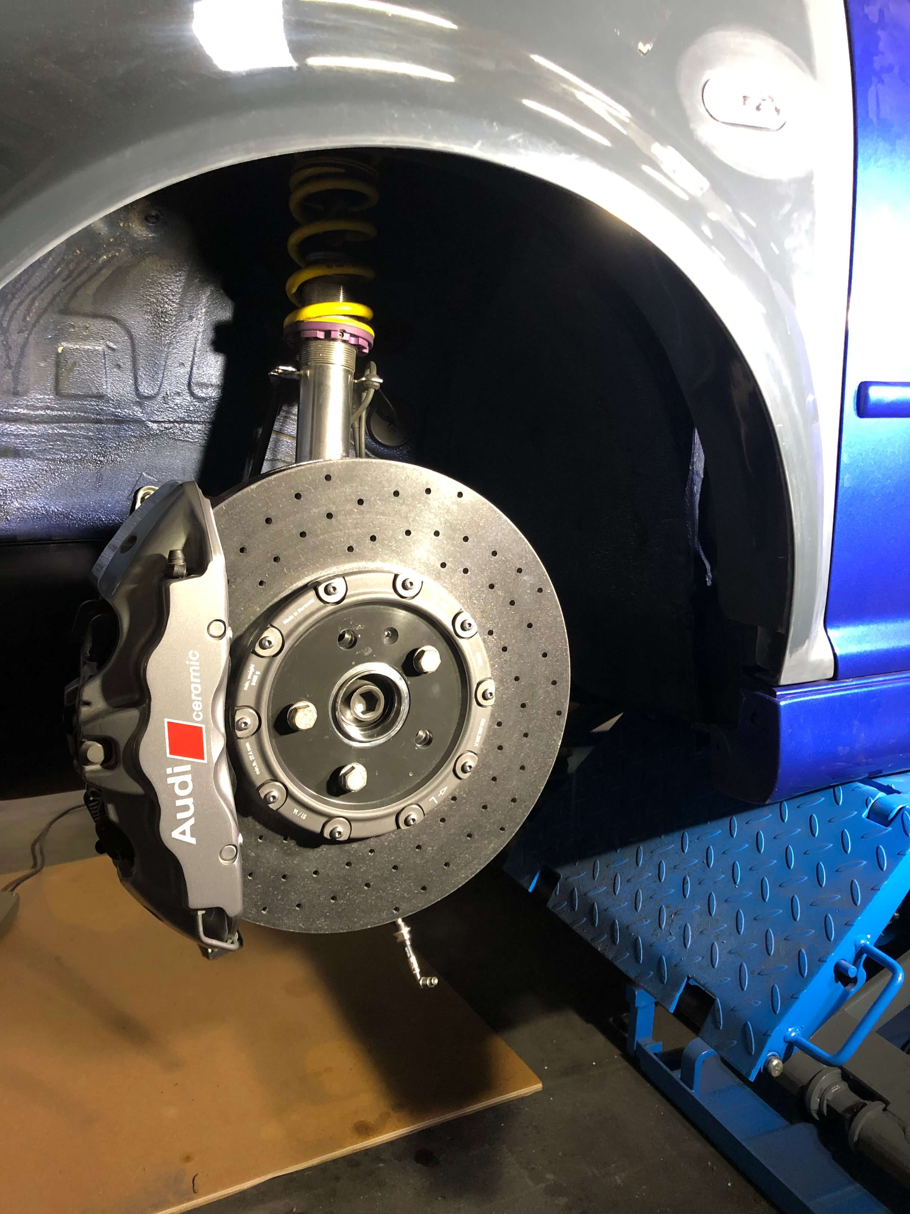 "En tout cas, nous y arriverons, car nous avons déjà monté un système de freinage céramique sur une VW Golf 4. La seule chose importante est que tu dois penser à modifier tes moyeux de roue en 5x112 en même temps, car le perçage des disques en céramique est très difficile".