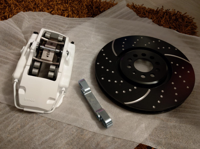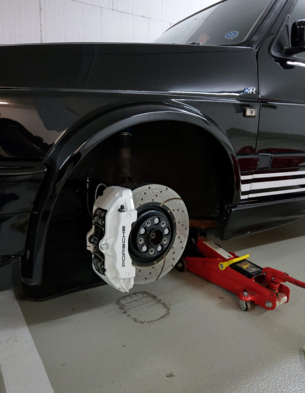 VW Golf 2 VR6 transformation sur adaptateur d'étrier de frein pour étriers de frein Brembo/ Porsche à 6 pistons en combinaison avec le disque de frein R32 334 x 32mm sur l'essieu avant et les étriers de frein arrière de la Porsche 996 et Aud S3 8L /VW Golf 4 R32 en combinaison avec les disques de frein avant 280mm G60 GTI 16V sur l'essieu arrière à conduire. ( 084261 )