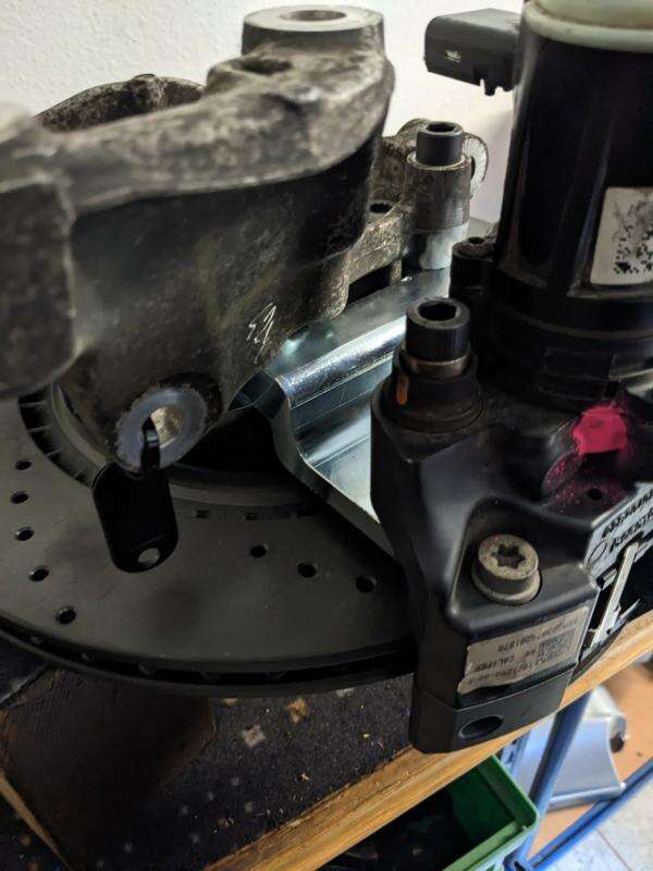 Comme nous avons ici le carter de roulement de roue pour la VW Golf 7R (identique à l'essieu arrière de la VW Passat B8 4-motion numéro OE : 5Q0505435J), Benjamin n'a eu qu'à nous donner le disque de frein Audi A6 A7 356x22mm et le frein à main électrique étrier du modèle Tesla X90 D (numéro L2S OE : 02125250D).