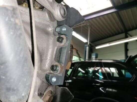 - Monter l'adaptateur avec les composants nécessaires et vérifier ensuite si de nouvelles conduites de frein sont éventuellement nécessaires, car il se peut, selon le modèle, que les anciennes ne soient pas assez longues ou que leur raccord ne soit pas adapté. Nous recommandons de passer à des conduites flexibles en acier en raison de leur efficacité nettement supérieure. Nous avons développé un configurateur de conduites flexibles en acier spécialement pour ce mode de fonctionnement, dans lequel tu peux les assembler selon tes souhaits et les poser ensuite. Cliquez ici pour accéder au configurateur de flexibles en acier >> Configurer une conduite de frein en acier flexible <<.