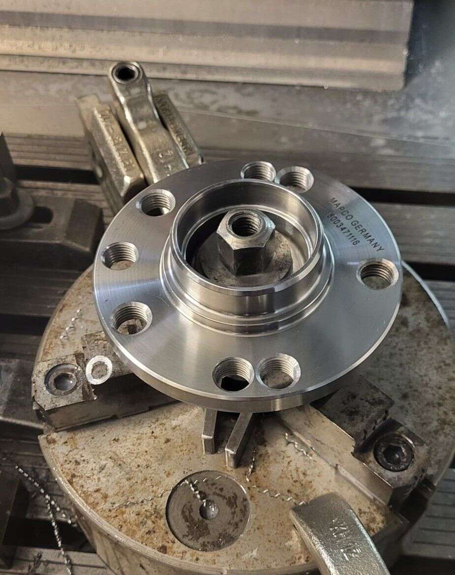 Ceci est nécessaire si, par exemple, tu souhaites installer des disques de frein plus grands provenant d'un autre véhicule, combiné avec nos adaptateurs d'étrier de frein sur ta voiture. Nous perçons alors un deuxième cercle de trous supplémentaire dans le moyeu de la roue, ou bien nous bouchons et soudons le cercle de trou, si tu souhaites modifier de 4 à 5 trous.