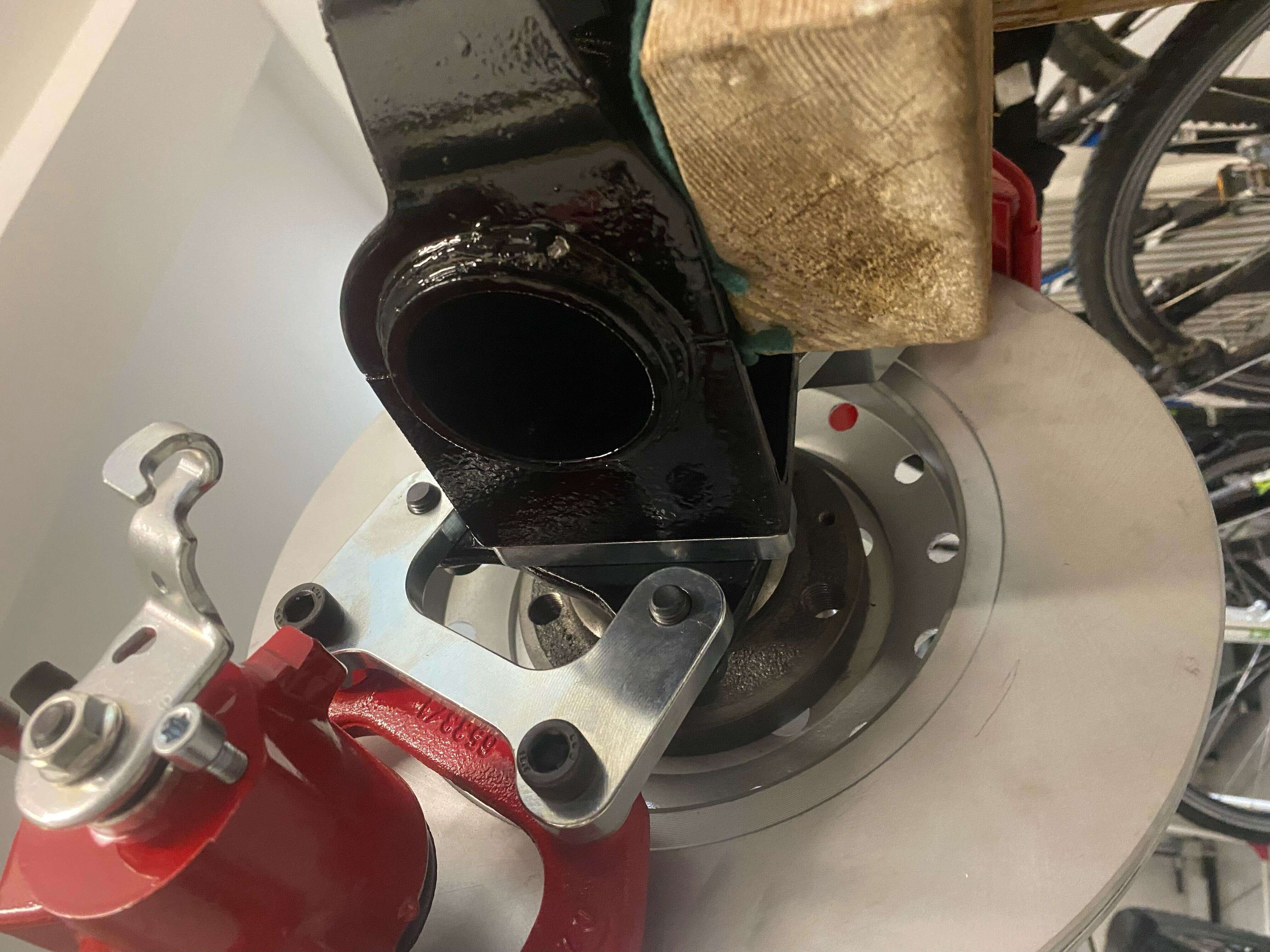 - Le câble de frein à main doit toujours être utilisé à partir de l'étrier monté, ce qui signifie qu'il se peut que le nouveau câble de frein à main doive encore être légèrement adapté. En cas de transformation, si l'étrier d'origine est conservé et que le câble de frein à main d'origine peut être utilisé, il se peut que tu doives le poser de manière plus directe pour compenser le diamètre plus important du disque et la distance plus longue.