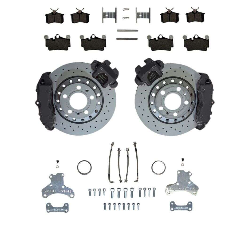 Avec ce kit de freinage haute performance, tu peux utiliser les étriers de frein Brembo à 4 pistons de Porsche Cayenne et l'étrier de frein à main VW Golf 4 R32 en combinaison avec les disques de frein 310x22 mm de la VW Phaeton sur Golf 4 Bora Vento Audi A3 Série et de nombreux autres véhicules.