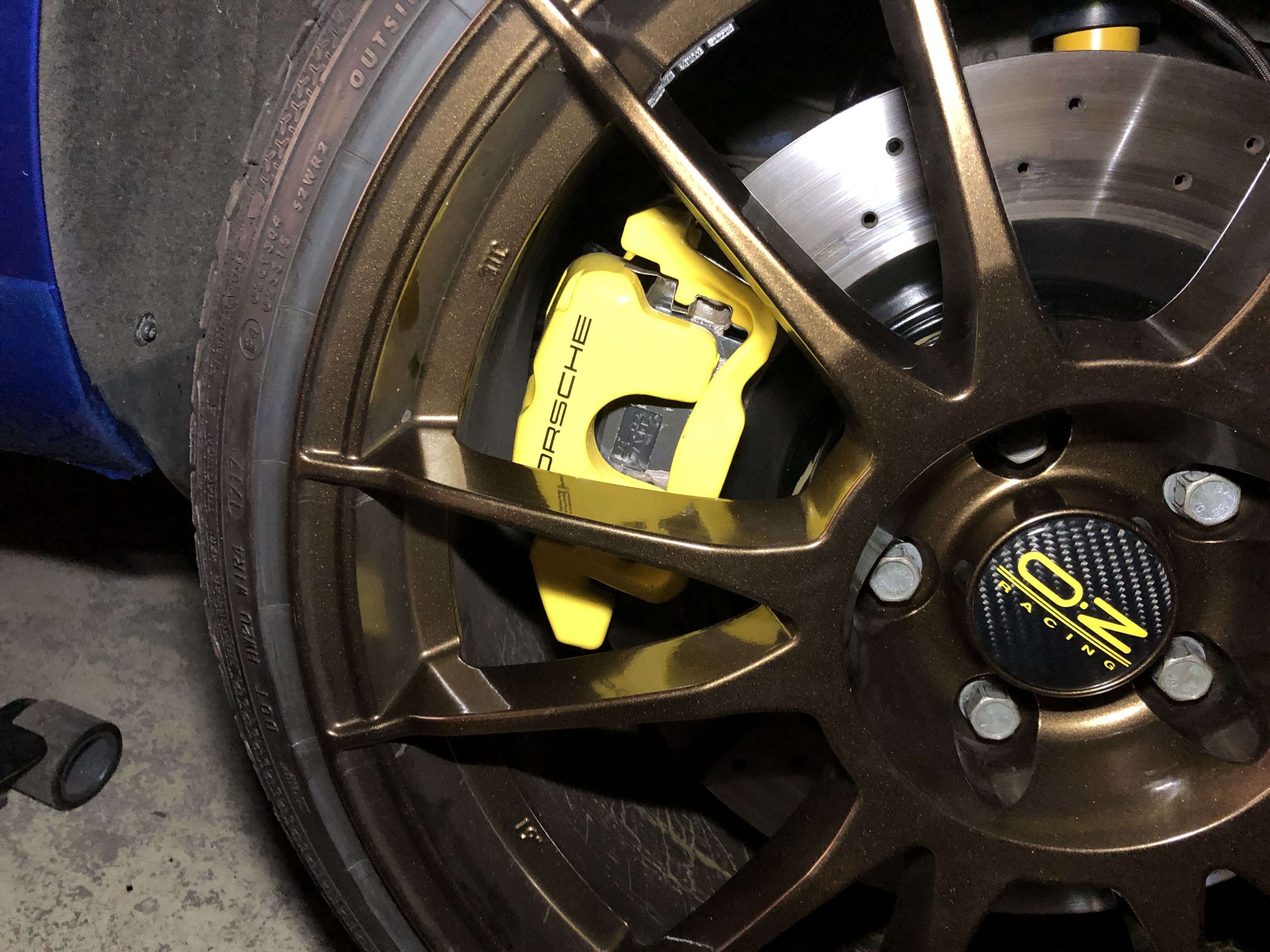 Les étriers Porsche sont raccordés au système hydraulique du véhicule et peuvent ainsi déployer une énorme force de freinage. Mais comme ils n'ont pas de fonction de frein à main, on utilise en plus la Golf 5 R arrière comme adaptateur d'étrier de frein à main. Le raccord hydraulique est alors fermé par un obturateur. Celui-ci ne sert donc que d'étrier de frein à main.