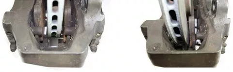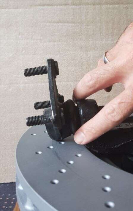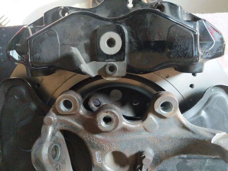 Montiere die Bremsscheibe und den Bremssattel einmal testweise auf deinem Achsschenkel, bevor du uns die Komponenten sendest. Es kann selten passieren, dass der neue Bremssattel zu nahe an der Originalaufnahme ist und somit kein Platz für ein Adapter ist (zu wenig Fleisch) und sich nicht auf der Achse verschieben lässt, dass siehst du auf dem linken Bild. Ist das der Fall, gehe bitte zum nächsten Punkt.