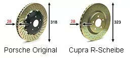 Wenn du beispielsweise eine Lochkreisanbindung von 5×100 hast, verwenden wir die Cupra R Scheibe mit 323×28. Der Durchmesser kann leicht abweichen, die Stärke jedoch muss identisch sein. Siehe Beispiel Foto zum Vergleich