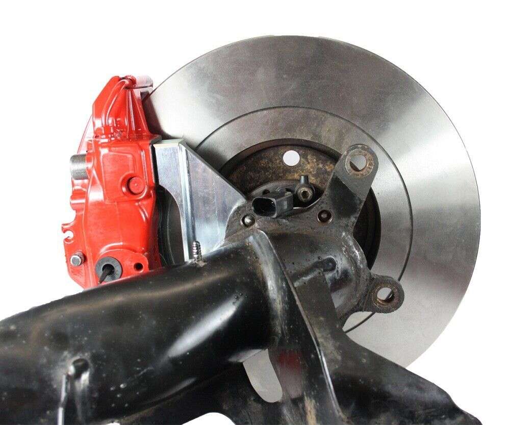 Passend für die Vorderachse bieten wir Ihnen Bremssatteladapter für eine Umrüstung auf die Porschebremsanlage in Verbindung mit der R32 Bremsscheibe an. Schauen Sie in unserem Shop!