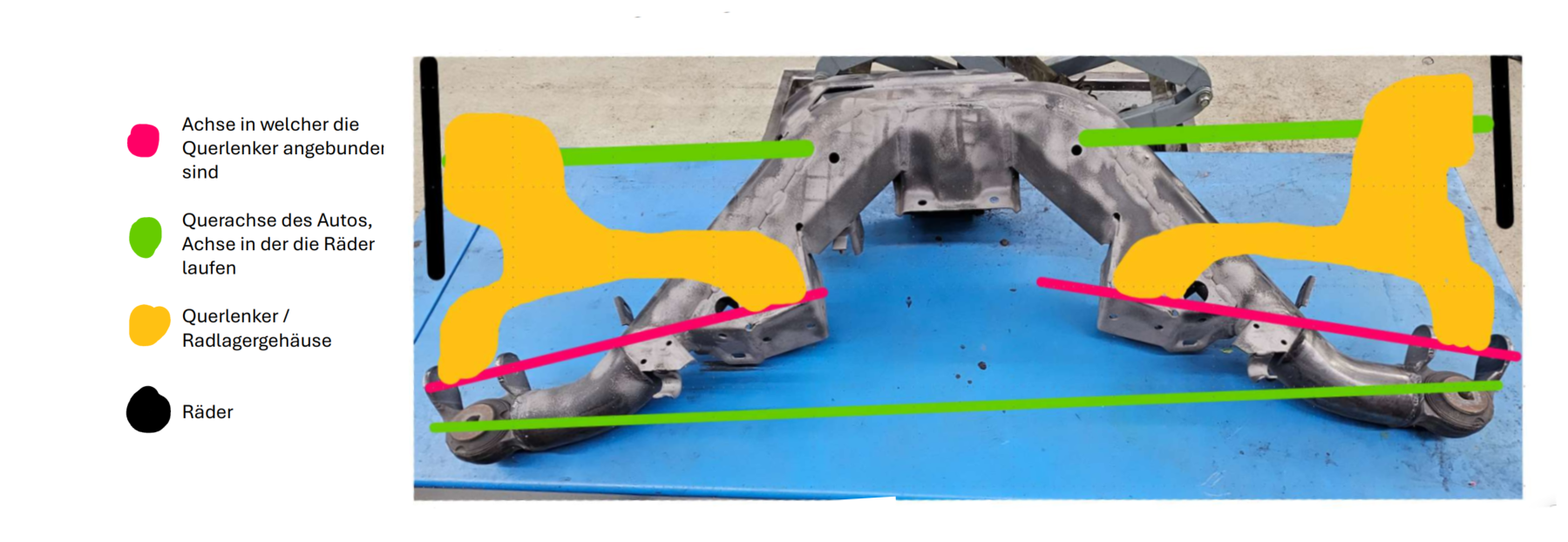 Vehicles such as the VW Golf 2 or 3 Syncro have a special design on the rear axle: the wishbones also act as wheel bearing housings, and the mounting points of these wishbones are not on the same axle as the wheels. This design imposes a number of design-related restrictions - particularly when the vehicle height is changed. If the vehicle is lowered, the rear wheels tilt inwards at the top (negative camber) and are positioned in relation to each other in the direction of travel. At the same time, the entire wheel position moves towards the rear. It is not possible to adjust the toe and camber at the factory, as the wishbones only have fixed screw points. This means that the wheel values are only in the optimum range in standard condition - any change in height leads to sub-optimal driving conditions.