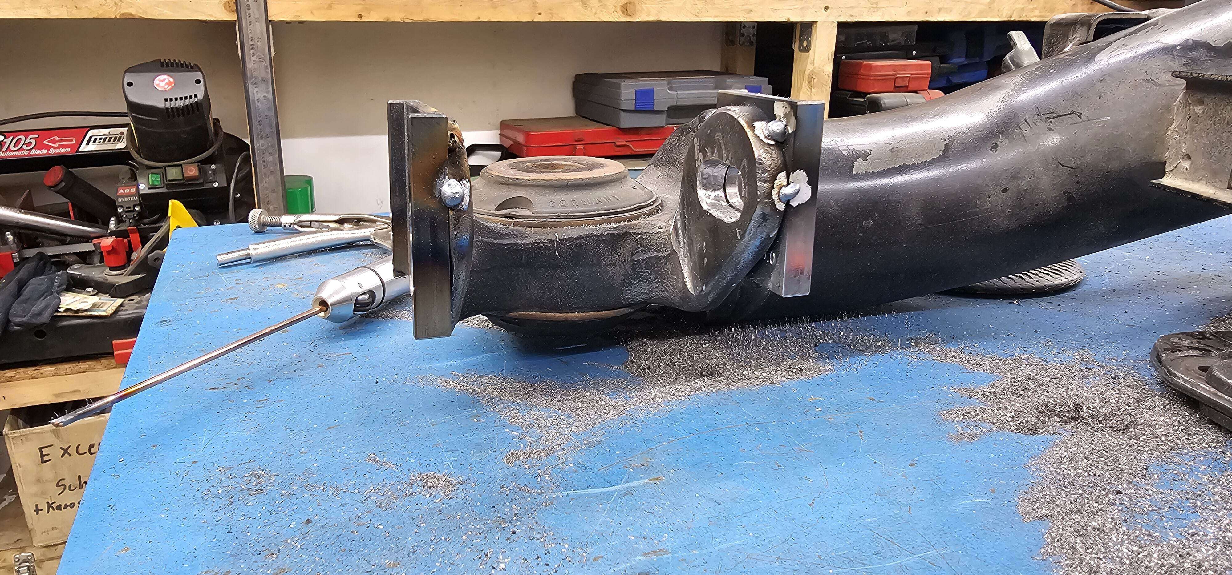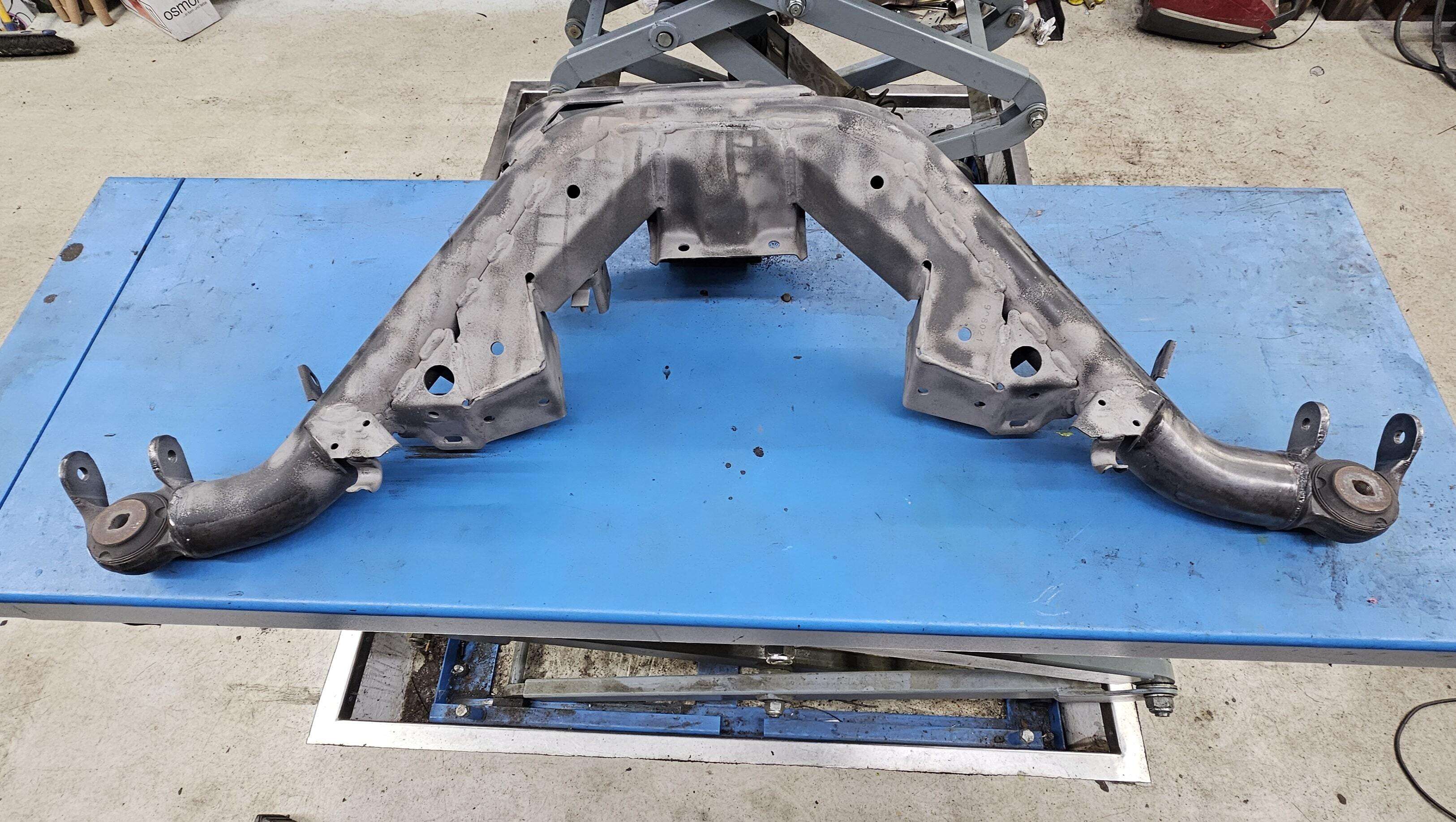A completely dismantled and disassembled rear axle subframe is required to carry out the conversion. This must be completely derusted and any coatings, wax and paint residues must also be removed in the area of the subsequent welding points - ideally using a sandblasting machine. After the welding work, comprehensive corrosion protection, such as powder coating or high-quality painting, is absolutely essential. Tools required include a welding machine, various drills and milling cutters, gripping pliers, a cordless screwdriver, square and spirit level, a multi-function tool with milling attachments, angle grinder with wire brush and measuring tools.