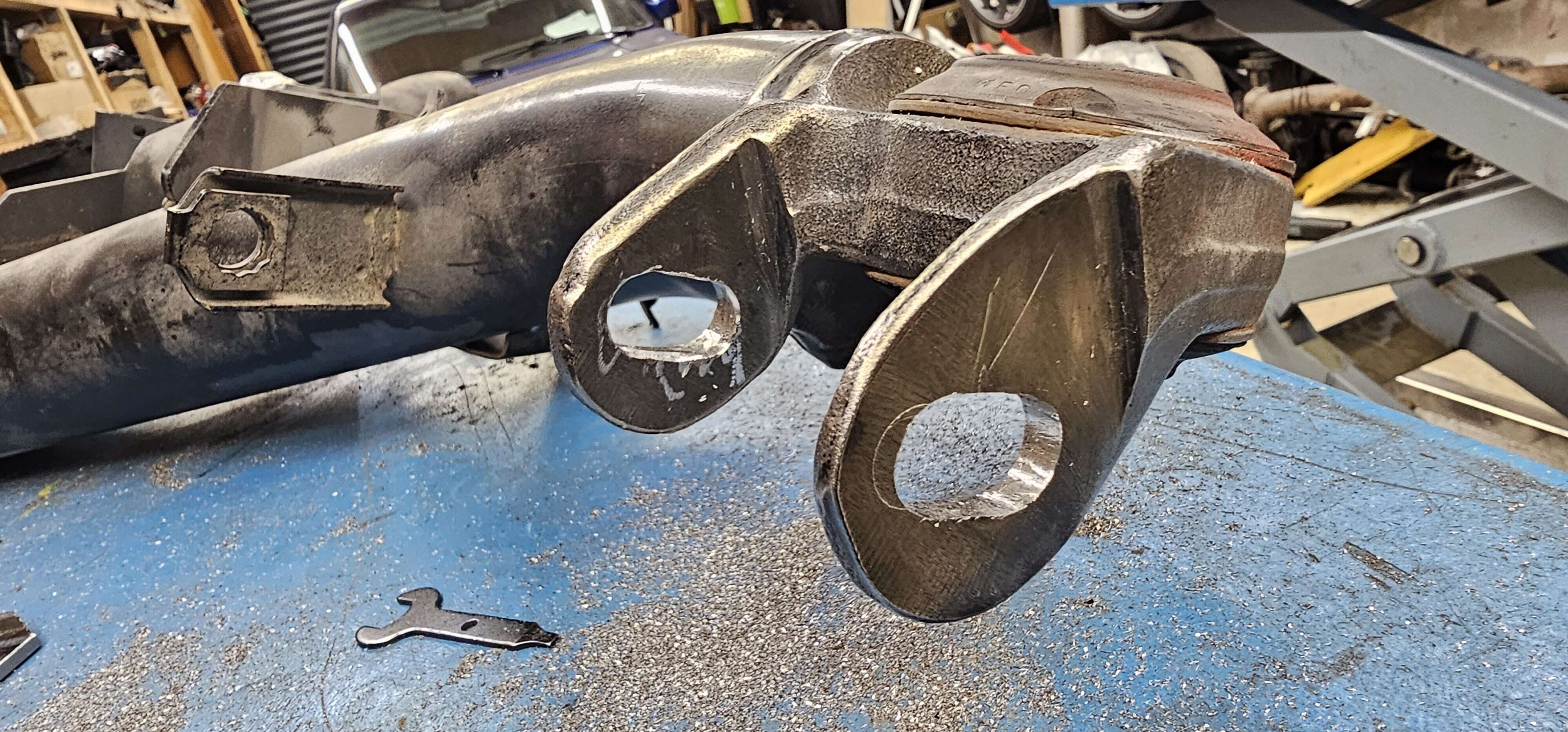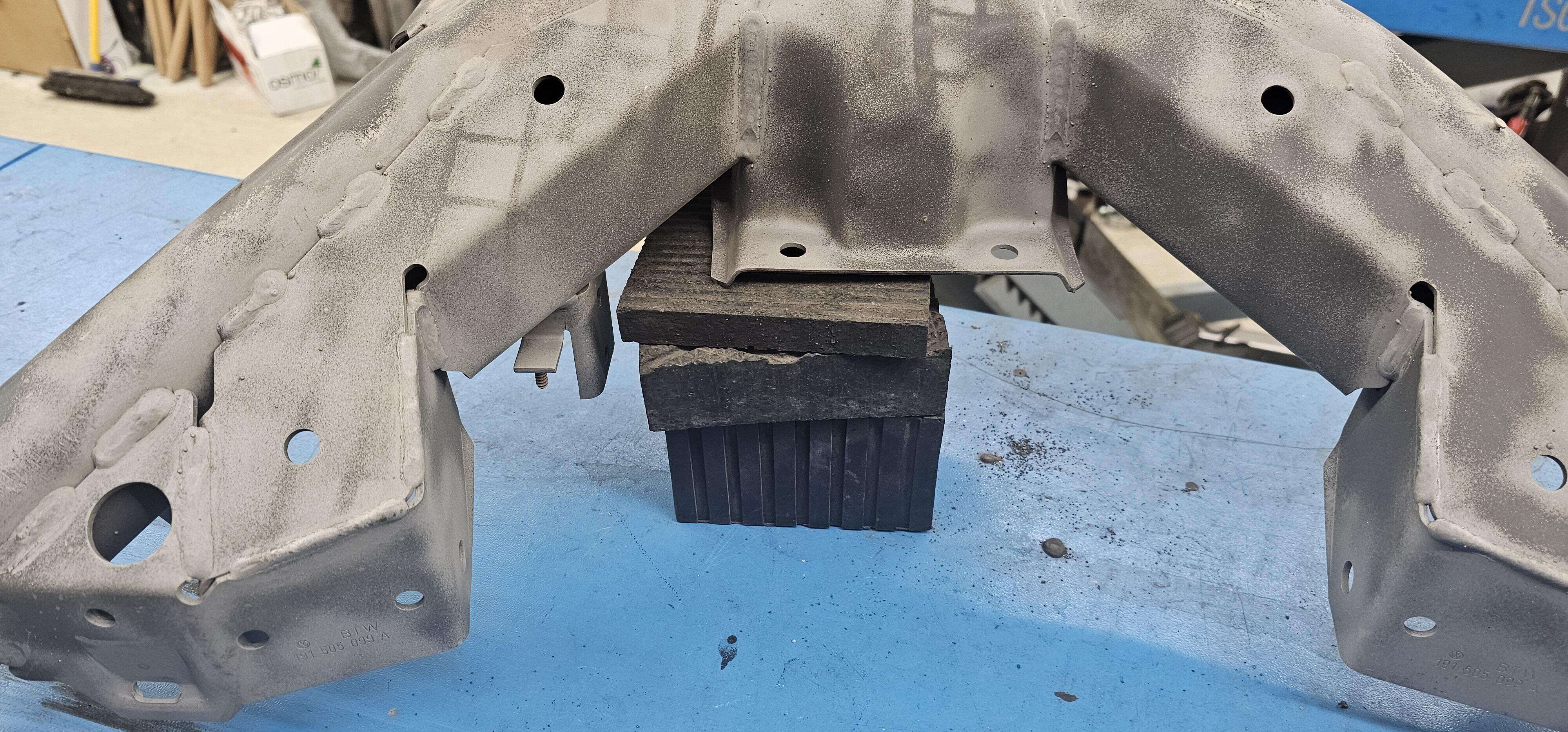 Ihe first step is to thoroughly prepare the subframe. Rust and old paintwork must be completely removed - preferably by sandblasting. In many cases, the two-part barrel bearings are worn. They can either be removed directly or used as rough measuring points for the time being. If they need to be reused, they must be removed before welding work begins. A helpful tip: The heat generated during welding often makes it easier to loosen the steel sleeves of the bearings than when they are cold. For the conversion, it is advisable to organise the work area sensibly. The tools should be within easy reach and the frame should be positioned in such a way that you can work without tiring - for example on a lifting platform or stable trestles. As the frame has to be rotated several times, sufficient space is crucial.