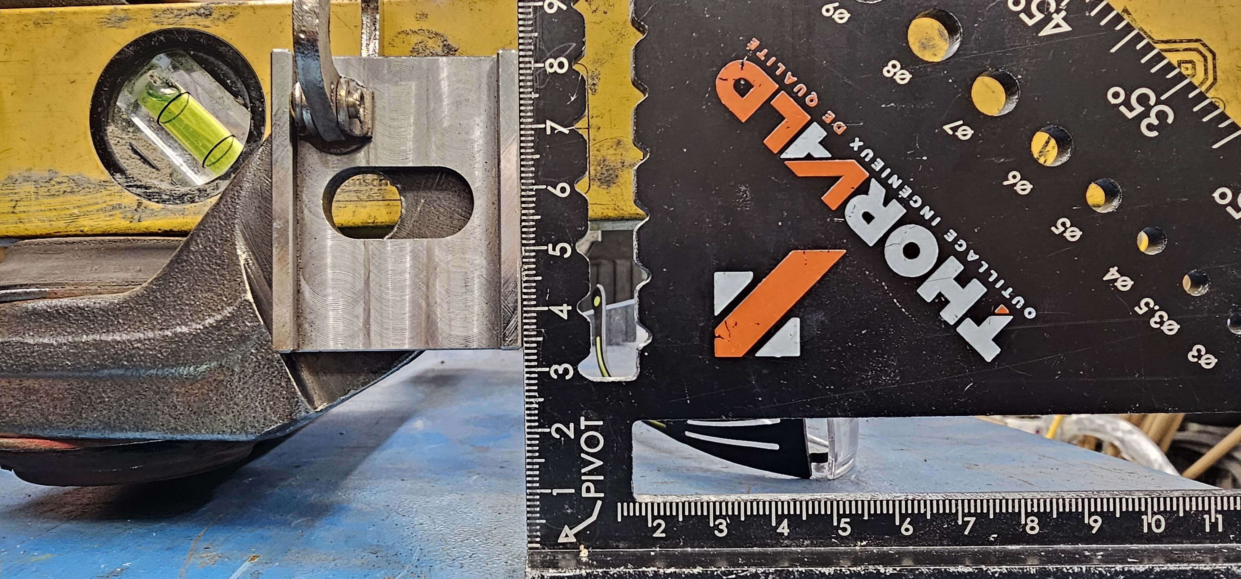 Once the subframe is correctly aligned, the two outer adjustment plates for the track adjustment can be fixed to the outer wishbone mounts using grip pliers. Ensure that they are aligned vertically (90° to the work surface). This allows the horizontal drilling height for the slotted holes to be marked. The end points of the slotted holes are not yet defined in this step - these will follow in the next phase. It is important that both panels are precisely aligned with each other to ensure even adjustment later on.