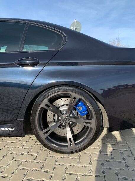 The BMW M5 brake calipers are simply screwed onto the original axle mount using our tuning adapter instead of the original caliper.