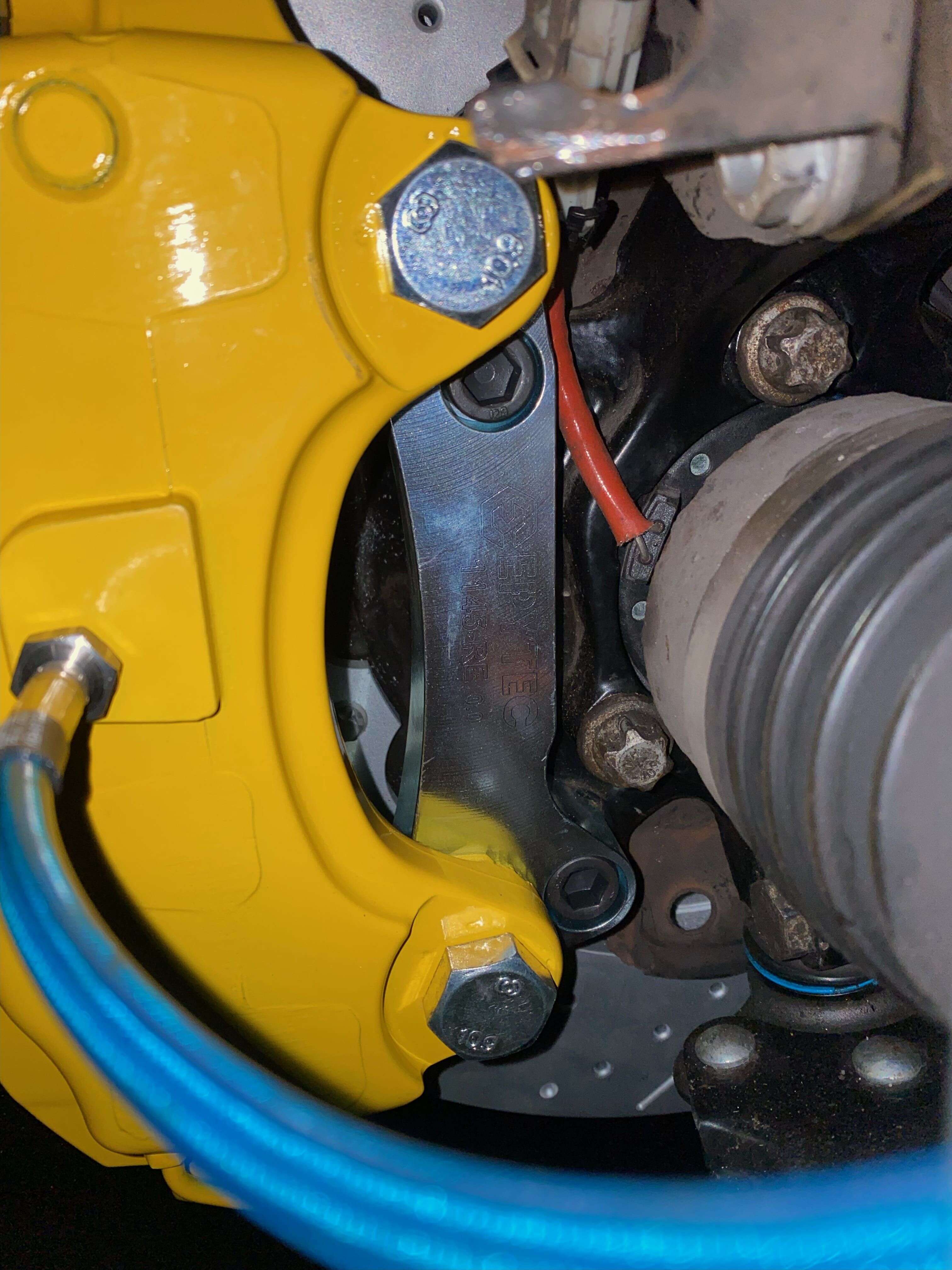 Brembo brake caliper adapter to be able to use the Porsche Cayenne ZR18 / ZL18 6-piston brake caliper in conjunction with the Mercedes CLK 360x32mm brake discs on the front axle of the Opel Astra G OPC.