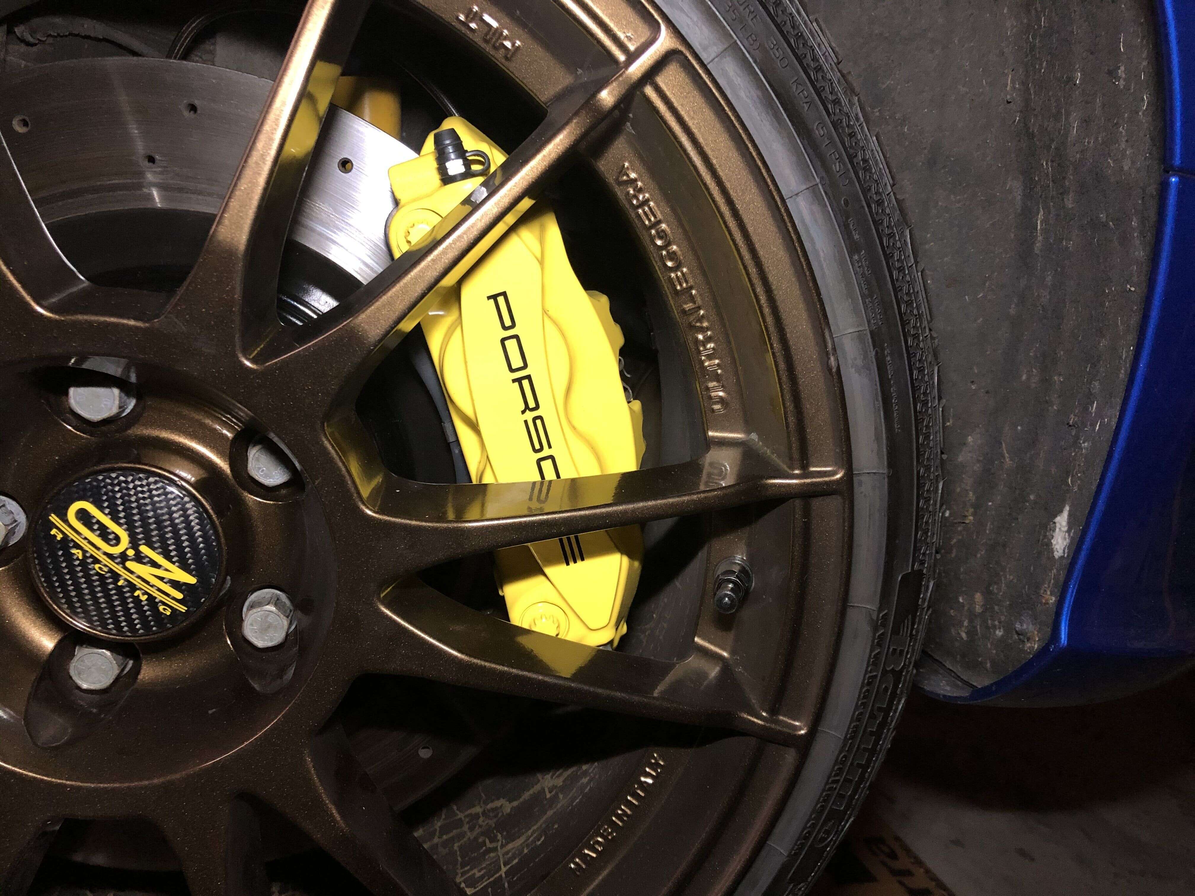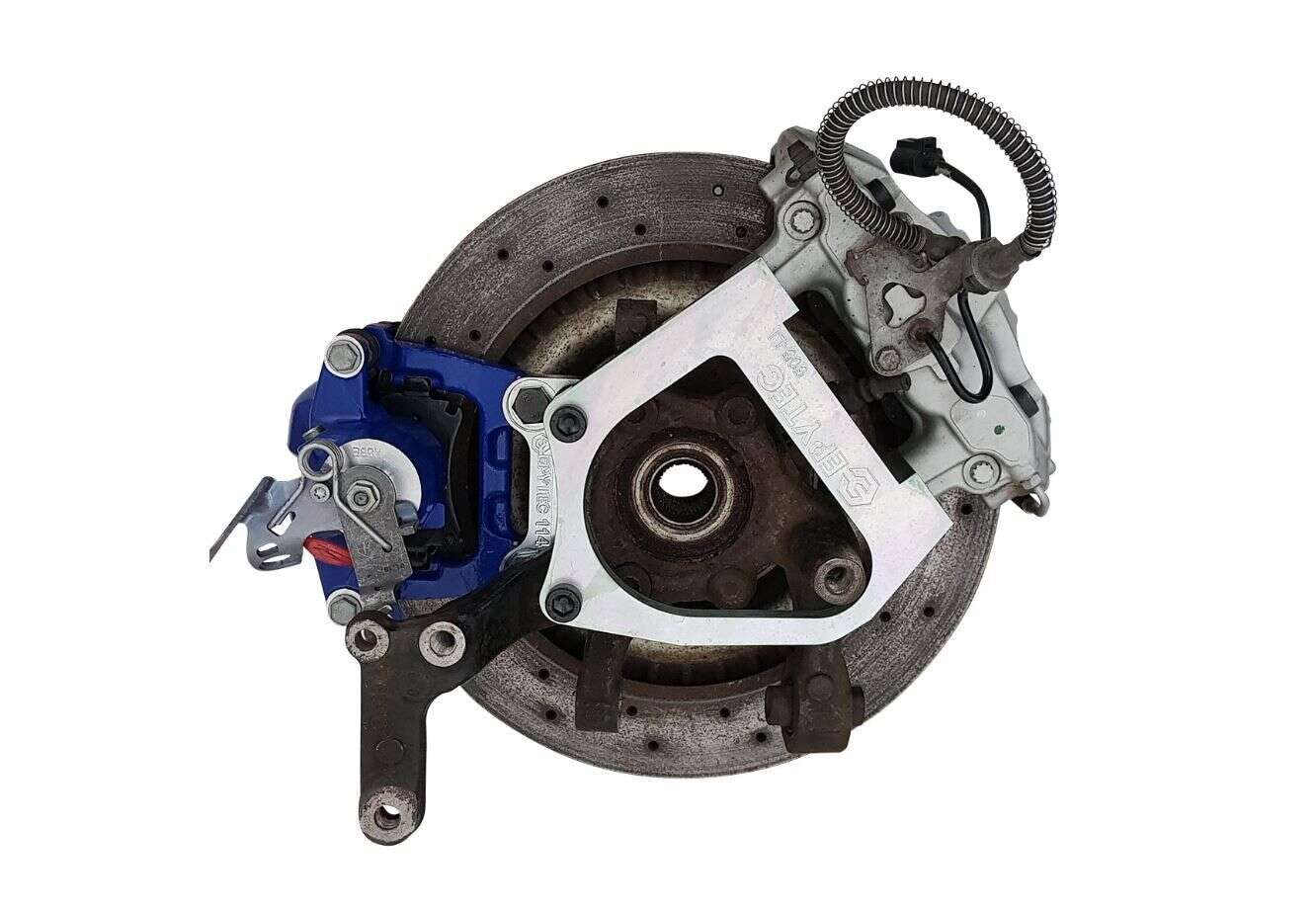 The Porsche callipers are connected to the vehicle's hydraulic system and can therefore develop enormous braking power. However, as these do not have handbrake functions, the rear Golf 5 R is also used as a handbrake caliper adapter. The hydraulic connection is sealed with a blind plug. This therefore only serves as a handbrake calliper.