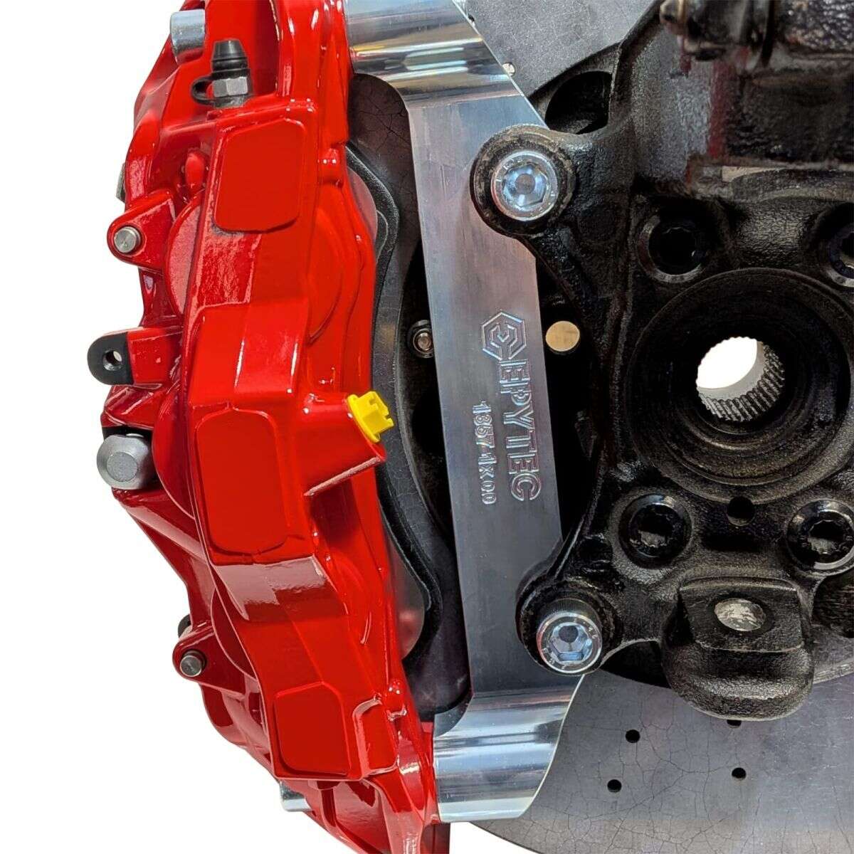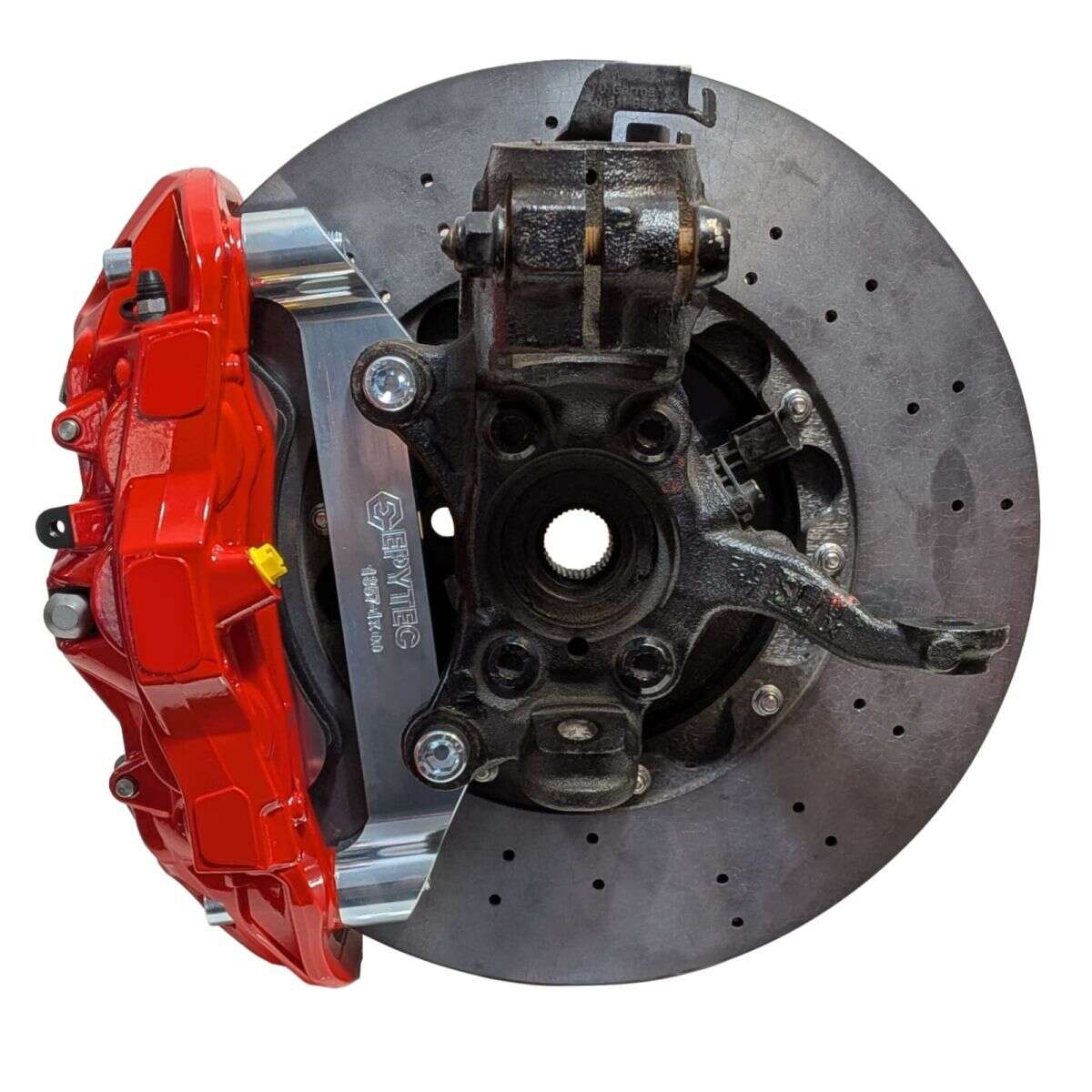 The Epytec brake caliper adapters enable the professional conversion of the front axle of the VW Golf 5 and VW Golf 6 and many other models with steel wheel bearing housings to the high-performance Mercedes W204 AMG 6-piston braking system. In combination with the Epytec ceramic brake disc in 380x36 mm from our own production including a matching brake disc pot, a big brake is created that meets the highest visual and technical demands in tuning. This upgrade ensures a significantly better braking performance, more durability and sportier deceleration – ideal for anyone who does not want to compromise on their conversion.