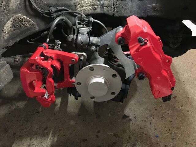 The Porsche calipers are connected to the hydraulics of the vehicle and can thus develop an enormous braking force. However, these do not have handbrake functions. The rear floated caliper of Audi R8 is additionally used as handbrake brake caliper adapter. The hydraulic connection is thereby closed with a blind plug / closure cap, thus this serves only as a hand brake caliper.