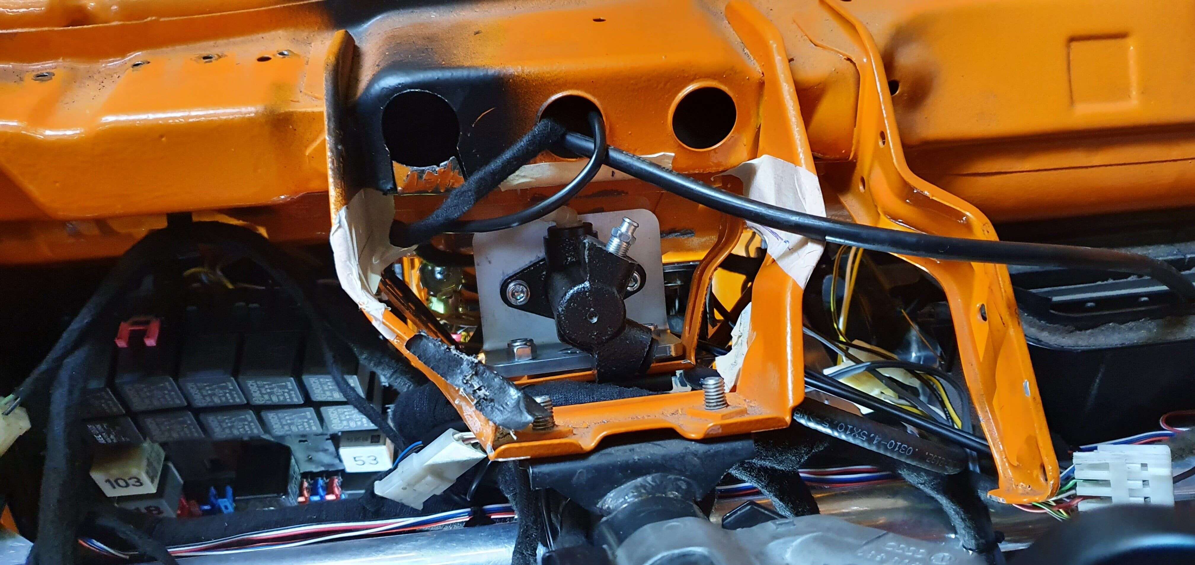 Achte beim Einbau darauf, ob der kleine Sicherungskasten oder der komplette Original-Kabelbaum verbaut ist. Mit dem kleinen Sicherungskasten kannst du den Umbau problemlos durchführen. Wenn der originale Kabelbaum verbaut ist, geht der Kabelbaum zum Armaturenbrett- und Lenksäulenschalter. Der Schalter für das Armaturenbrett und die Lenksäule wird durch den Spalt geführt, in dem der Zylinder eingebaut ist. Hier solltest du darauf achten, dass die Kabel ausreichend vor Kontakten geschützt sind. Die Befestigung des Kabelbaums an der Karosserie erfolgt am besten mit Kabelbindern. Hierfür gibt es in unmittelbarer Nähe zwei originale Löcher, die genutzt werden können. Dies kannst du auf den Montagebildern sehen.