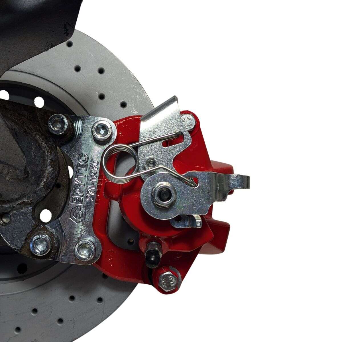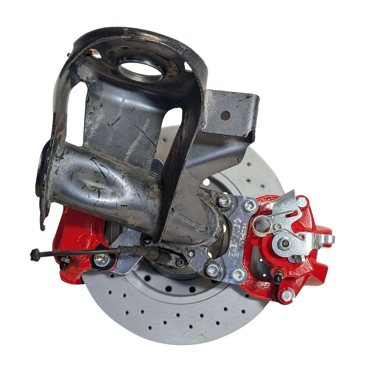 Die Porschesättel werden an die Hydraulik des Fahrzeuges angeschlossen und können somit eine enorme Bremskraft entfalten. Da diese aber keine Handbremsfunktionen haben, wird zusätzlich der hintere Audi S3 bzw. Golf 4 R32 als Handbremssatteladapter verwendet. Der Hydraulikanschluss wird dabei mit einem Blindstopfen verschlossen. Somit dient dieser nur als Handbremssattel.