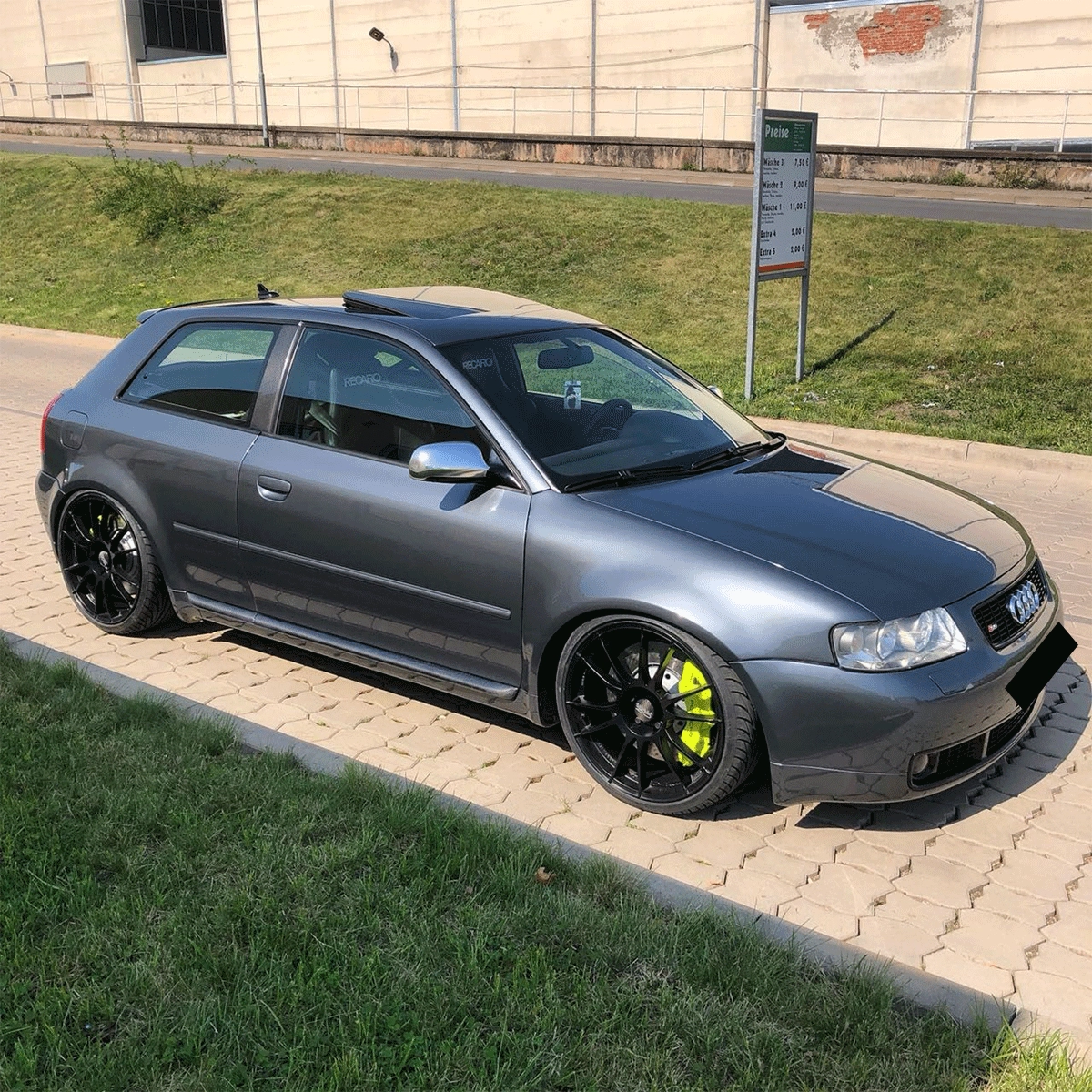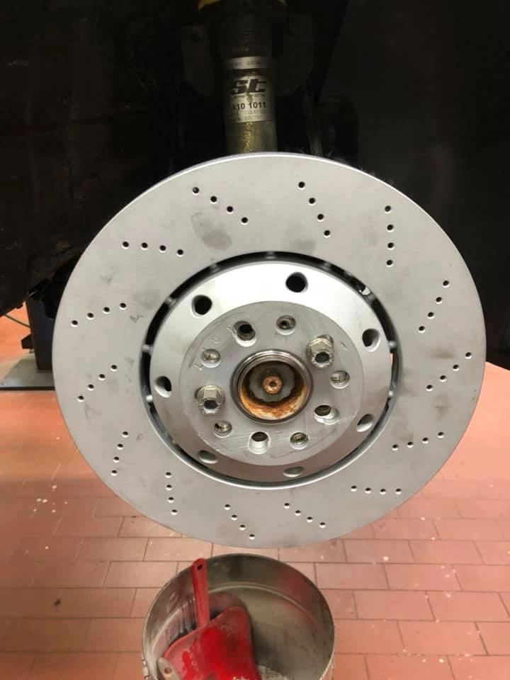 Da die RS4 Bremsscheibe durch die hohe Gesamthöhe am Querlenker anstehen würde haben wir 8mm Spurplatten entwickelt, die unter die Bremsscheibe montiert werden. Damit wandern die Bremsscheiben weiter raus. Außerdem wird die Bremsscheibe mit diesen Spurplatten perfekt auf dem Achsschenkel zentriert. Die Spurplatten sind selbstverständlich im Lieferumfang enthalten.