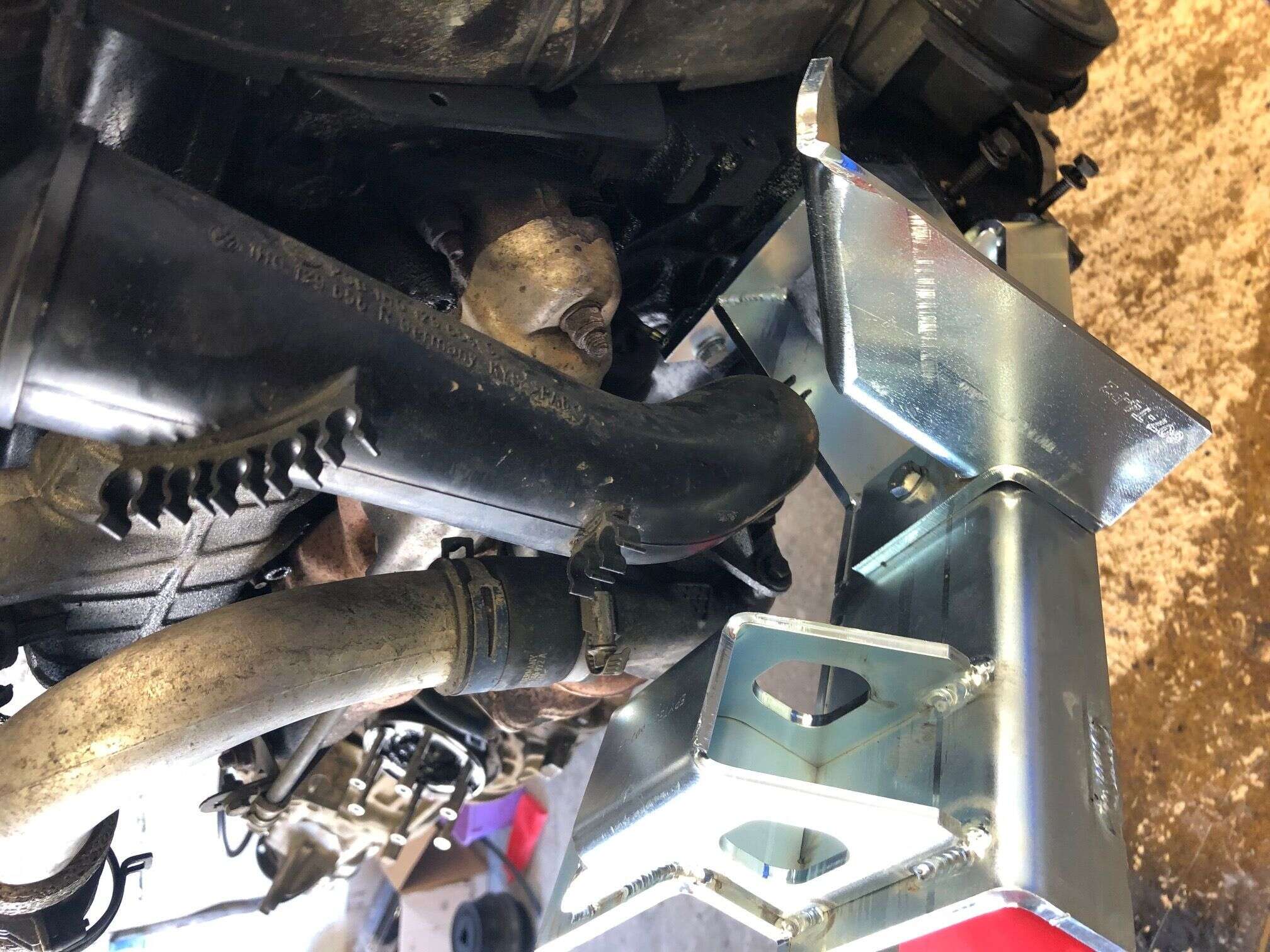 Unser Motorhalter wurde so konstruiert, dass er in Verbindung mit originalem Motorhalter des TD verwendet werden kann. Somit sind keine weiteren Halter nötig! Die Halterung für den Auspuff kann durch Verschraubungen abgenommen oder nach Wunsch auch versetzt werden, da beim Montieren der Auspuffhalterung oft kleinere Anpassungen, bedingt durch Toleranzen in der Karosse, gemacht werden müssen.